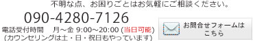 | Tel: | 090-4280-7126(電話に出ない場合は、留守番電話にお名前・ご連絡先・ご用件を入れてください。折り返しお電話いたします。) |